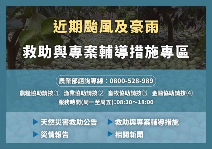 因應丹娜絲颱風及連續豪雨造成全臺各地農漁產業嚴重損失,農業部已啟動各項救助公告、金融協助方案及產業輔導措施,為確保農漁民與農企業能即時獲取完整資訊,除公布於農業部官網「近期颱風及豪雨專區」外,特設置農業諮詢專線0800-528-989,由專人依不同產業別與申辦需求即時回復,協助農民於申辦過程遇有相關問題時,得以即時獲得專業協助,請農漁民、農企業多加利用。