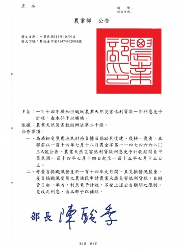 二、考量114年樺加沙颱風災損情況嚴重,為減輕受災農漁民財務負擔及協助其復建、復耕、復養,提供因114年樺加沙颱風申貸之「農業天然災害低利貸款」(下稱天災貸款)及「農民組織及農企業天然災害復耕復建貸款」(下稱農企業災貸)案件,自撥貸日起1年內,利息免予計收,由農業部予以補貼,免息期間,免收農信保保證手續費。受災農漁業者檢附農業天然災害受災證明書等文件,經貸款經辦機構核貸後,即可自撥貸日起直接享有免息優惠。